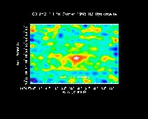 This image shows, in false color, the emission from carbon monoxide molecules in Comet C/1996 B2 Hyakutake shortly before it passed the Earth. The emission shows up as reddish/white here. The image was made on 21 March 1996, with the NRAO 12m radiotelescope atop Kitt Peak, Arizona, by Jeff Mangum using the newly implemented `on-the-fly' mapping technique. The spectral line here is very narrow, but emission has been integrated over all velocity channels to construct this image. The nominal telescope beam is 30" at 1.3mm wavelength, but the image was convolved to 40" resolution to improve the signal to noise ratio. As a comet warms on its journey around the sun, molecules boil off of the icy nucleus. CO boils off particularly far from the sun, when the nuclear temperature is only about 20 K, and powers activity in the comet's coma far from the sun. As the comet approaches the sun, the evaporation of other molecules powers increasingly violent activity. Three days after this image was taken, emission from ammonia molecules was detected with the NRAO 43m telescope in Green Bank, West Virginia. The ammonia emission suggested that the temperature of the gas near the nucleus was 67 K at that time, sufficiently warm for many molecules to leave the nucleus.