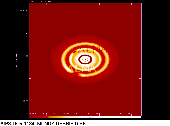 This is a simulation of a modestly bright debris disk at a distance of 12 pc around a sun-like star. The total emission is 10 mJy at this observing frequency, 345 GHz. The disk inner radius is 2 AU; the outer radius is 100 AU. The mass of the disk corresponds to roughly 0.4 lunar masses of dust, or 0.5 Earth masses of gas plus dust assuming a gas-to-dust ratio of 100.