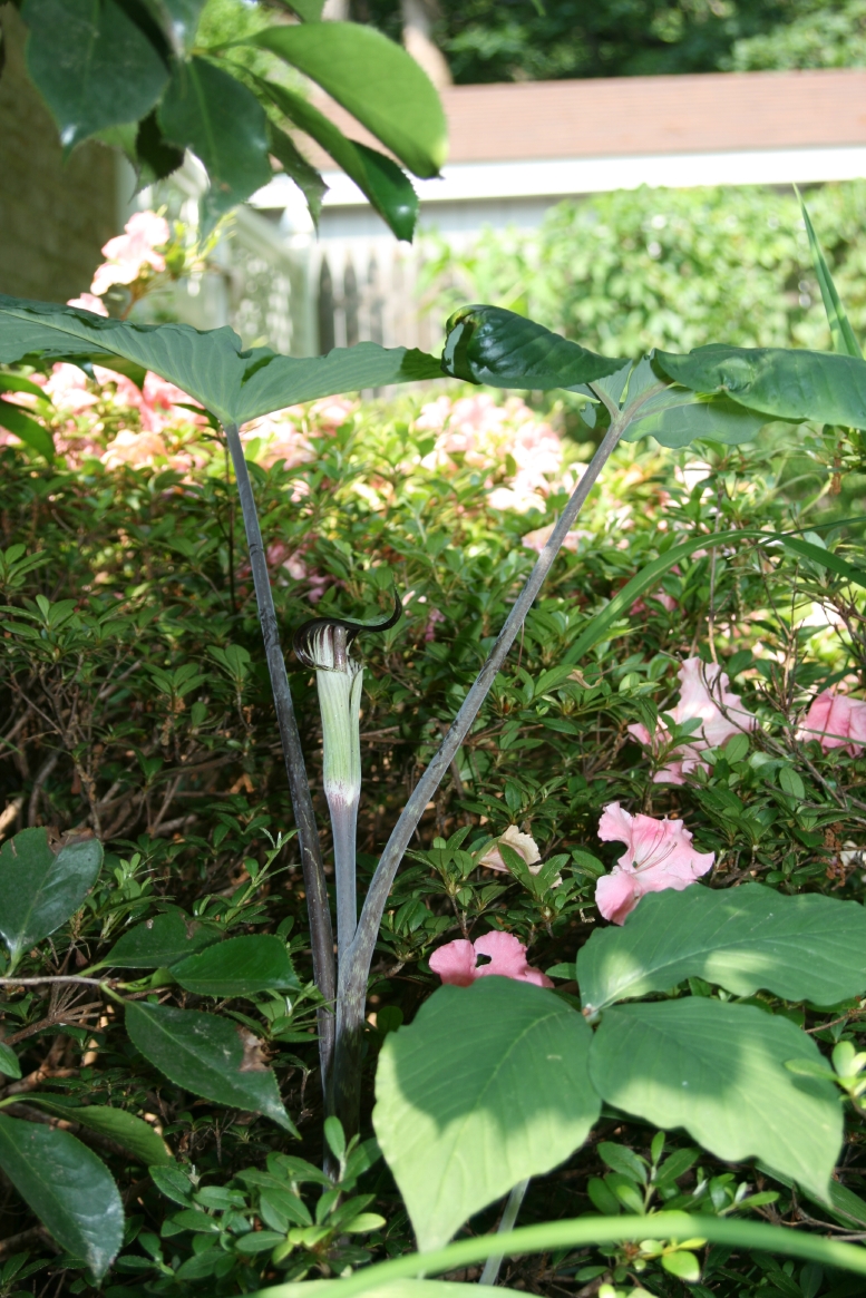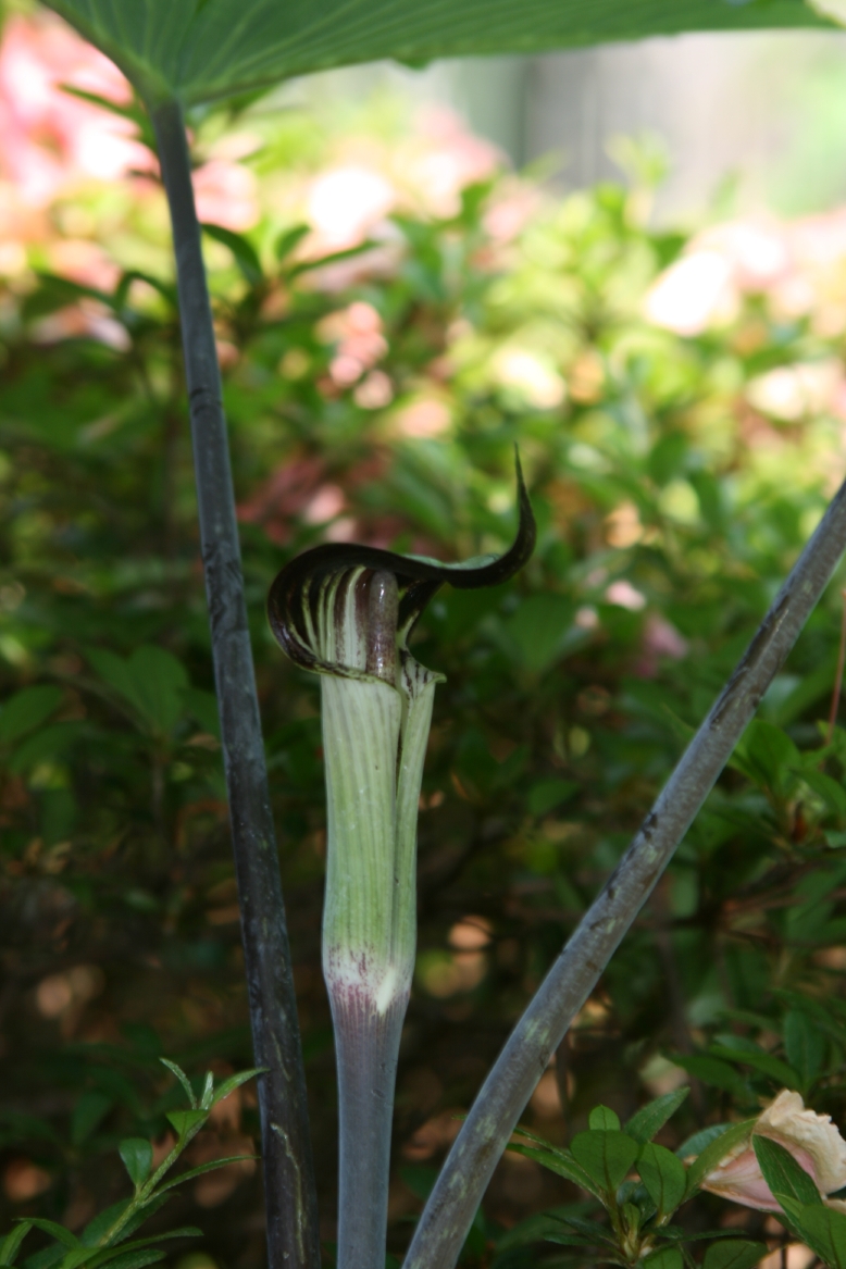 A plant which I received as A. fargesii blooms against a backdrop of pink azalea. I now suspect this may be A. triphyllum (spathe blunt, not pointed; this